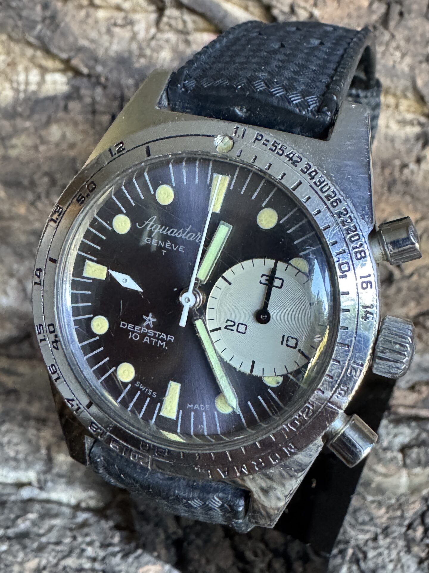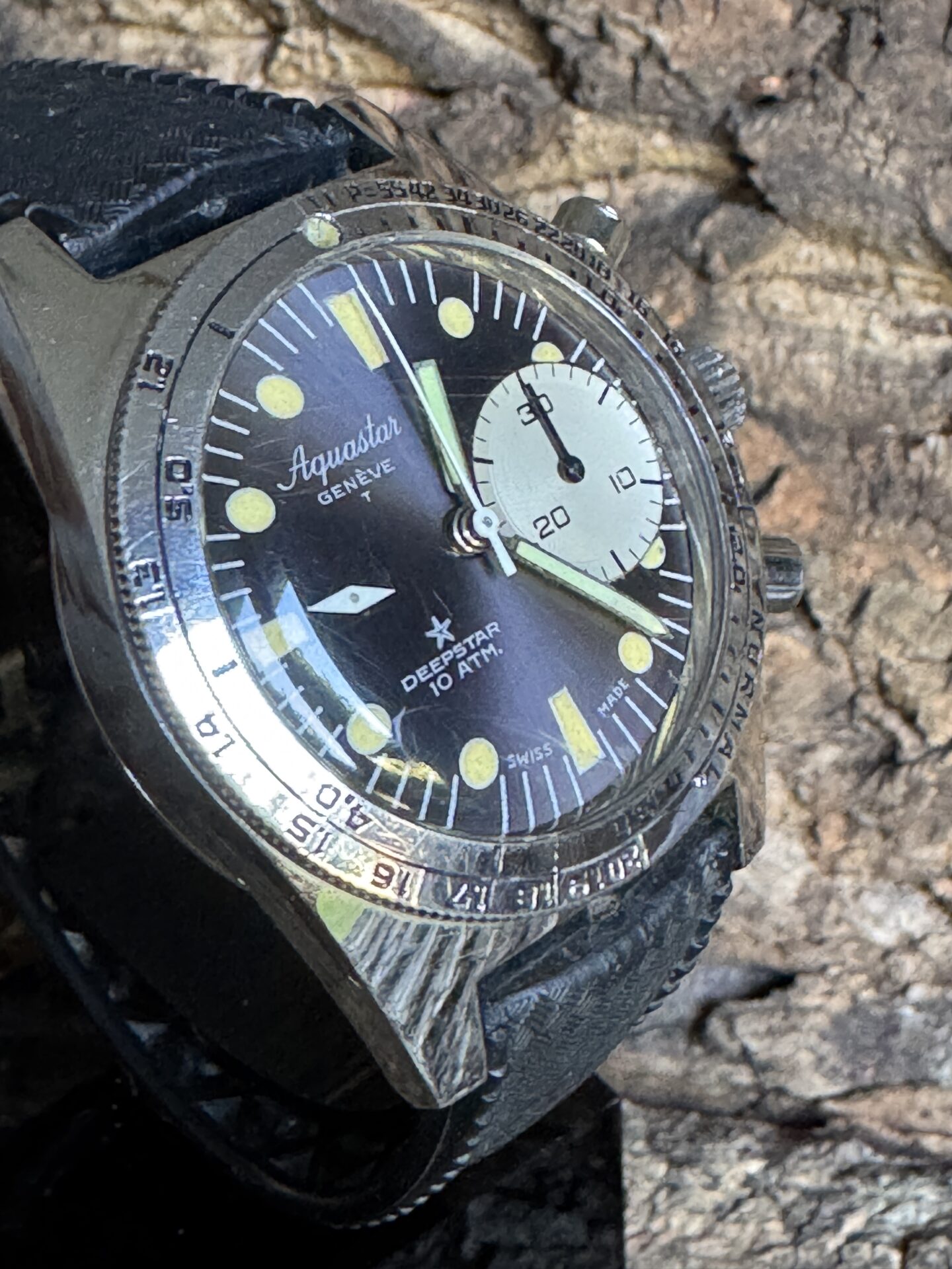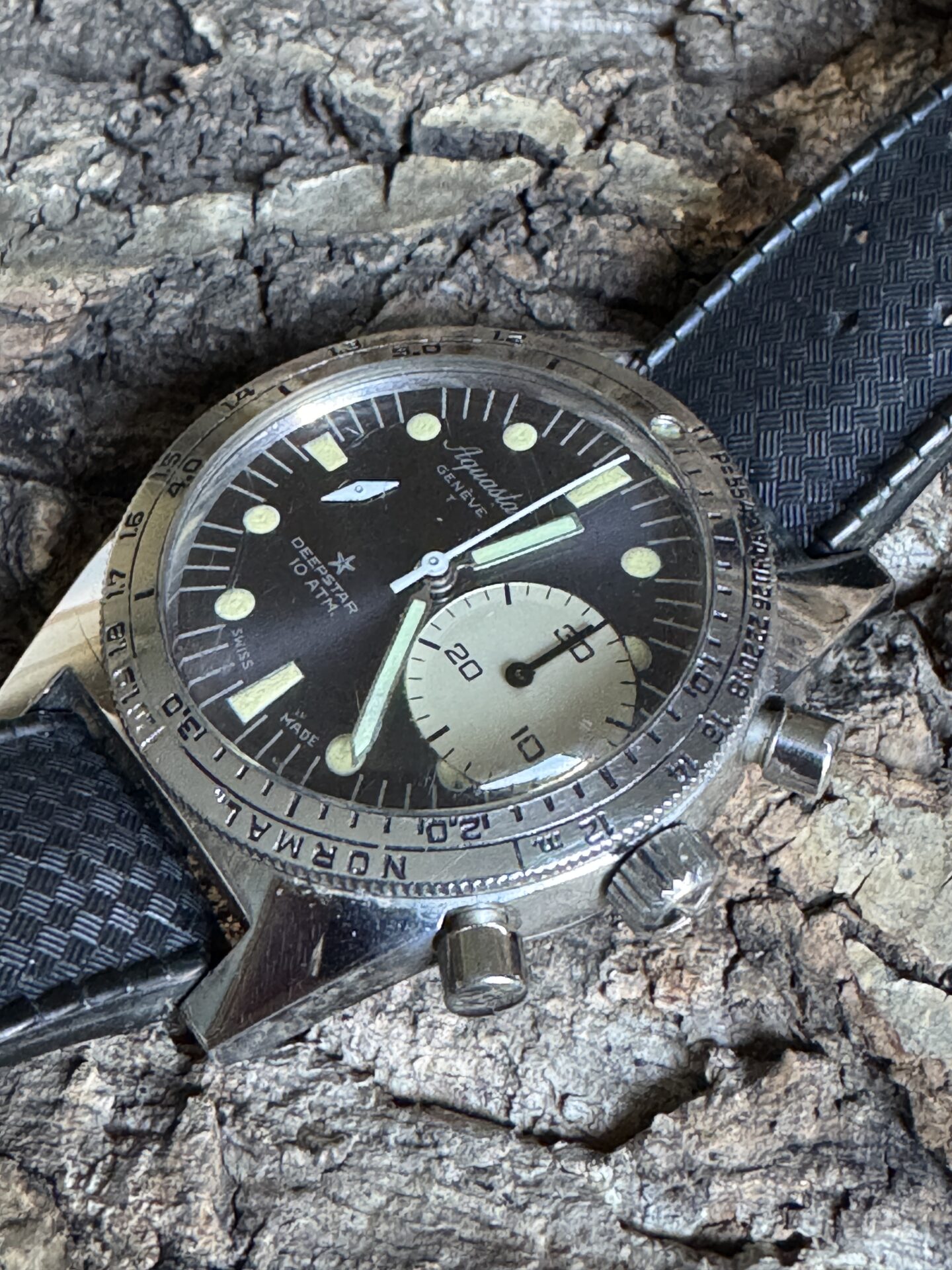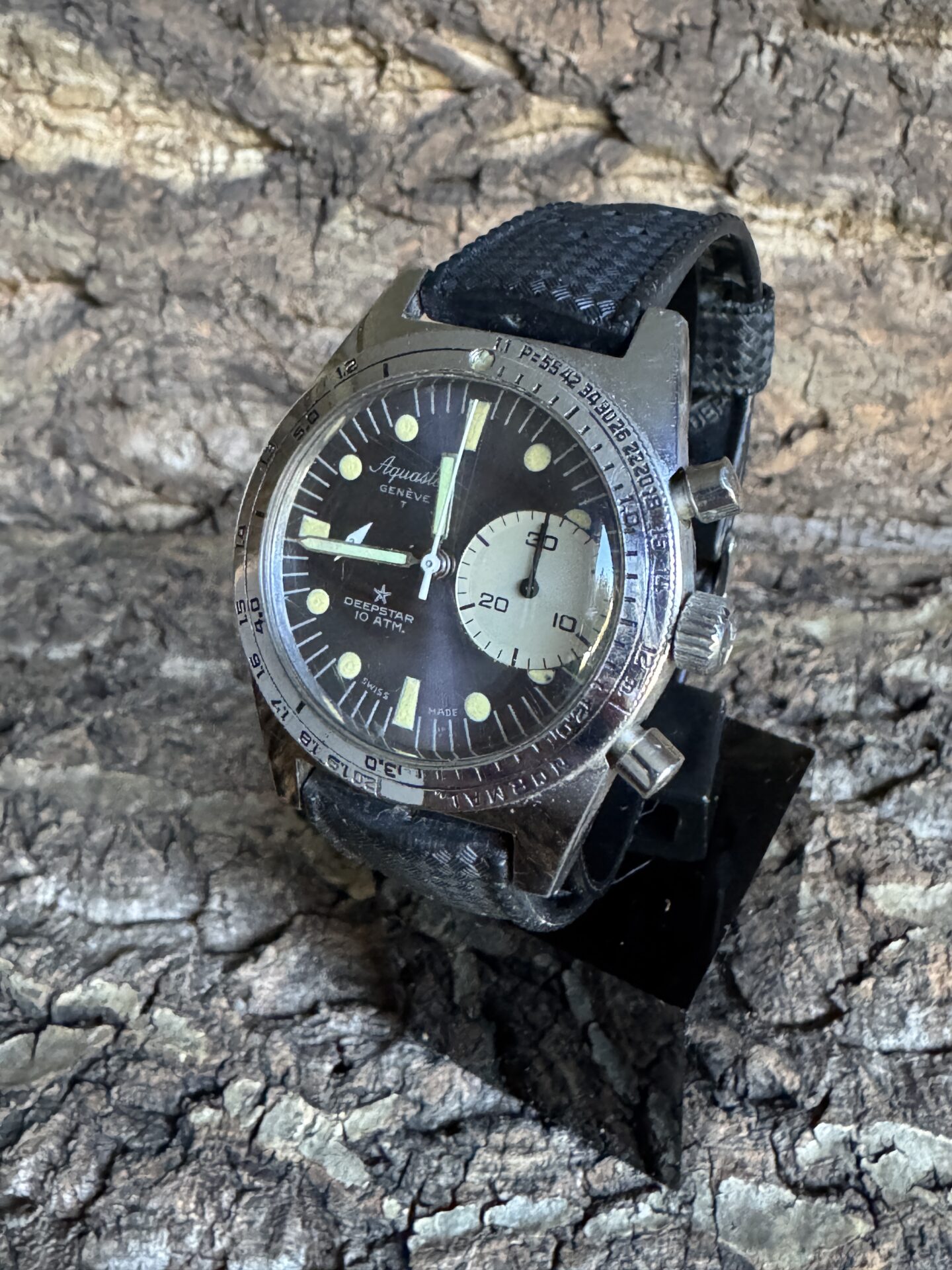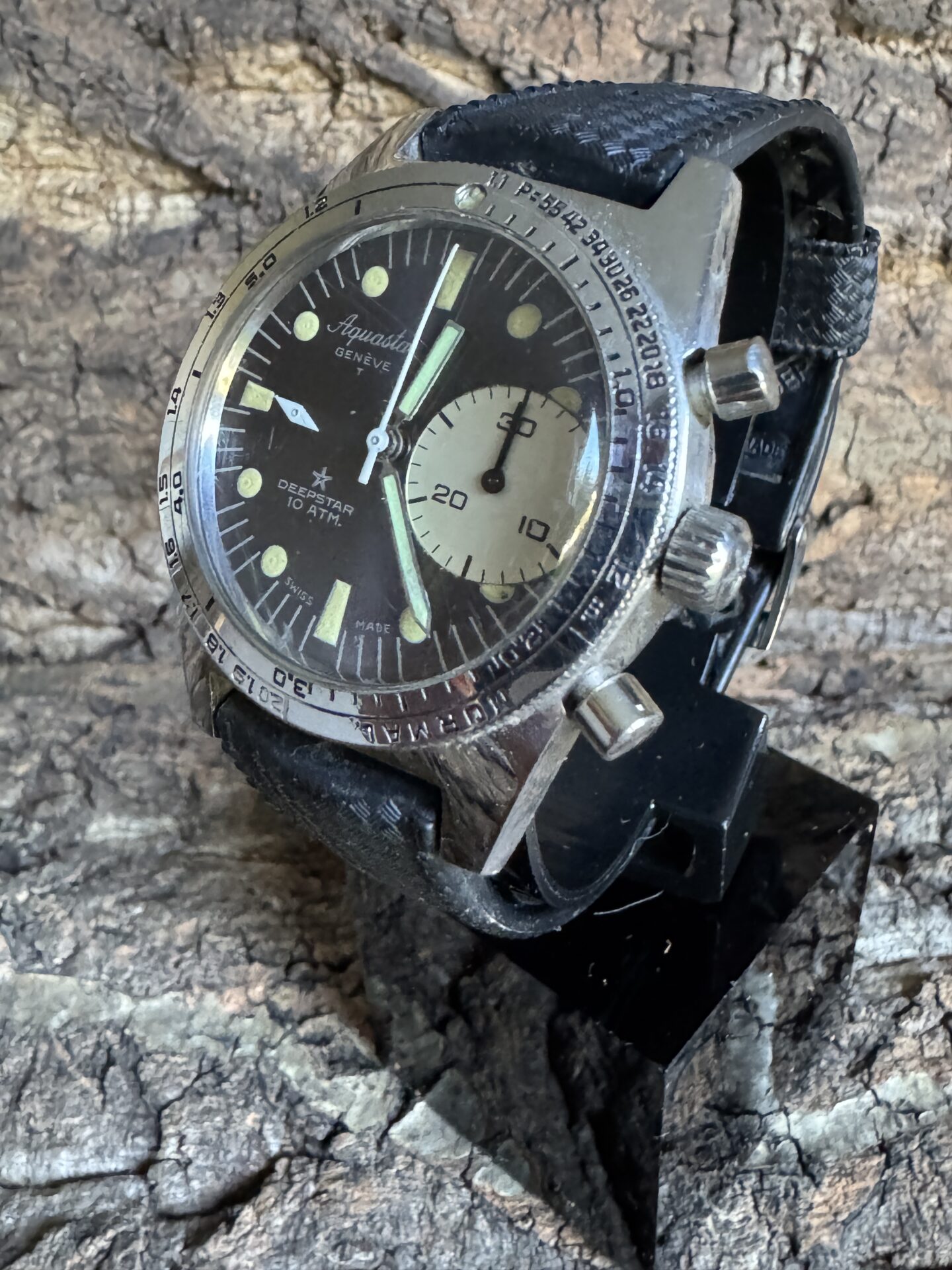 We present a rare Aquastar Deepstar 10Atm manual winding diving chronograph from the 1960s, in excellent cosmetic and working condition.