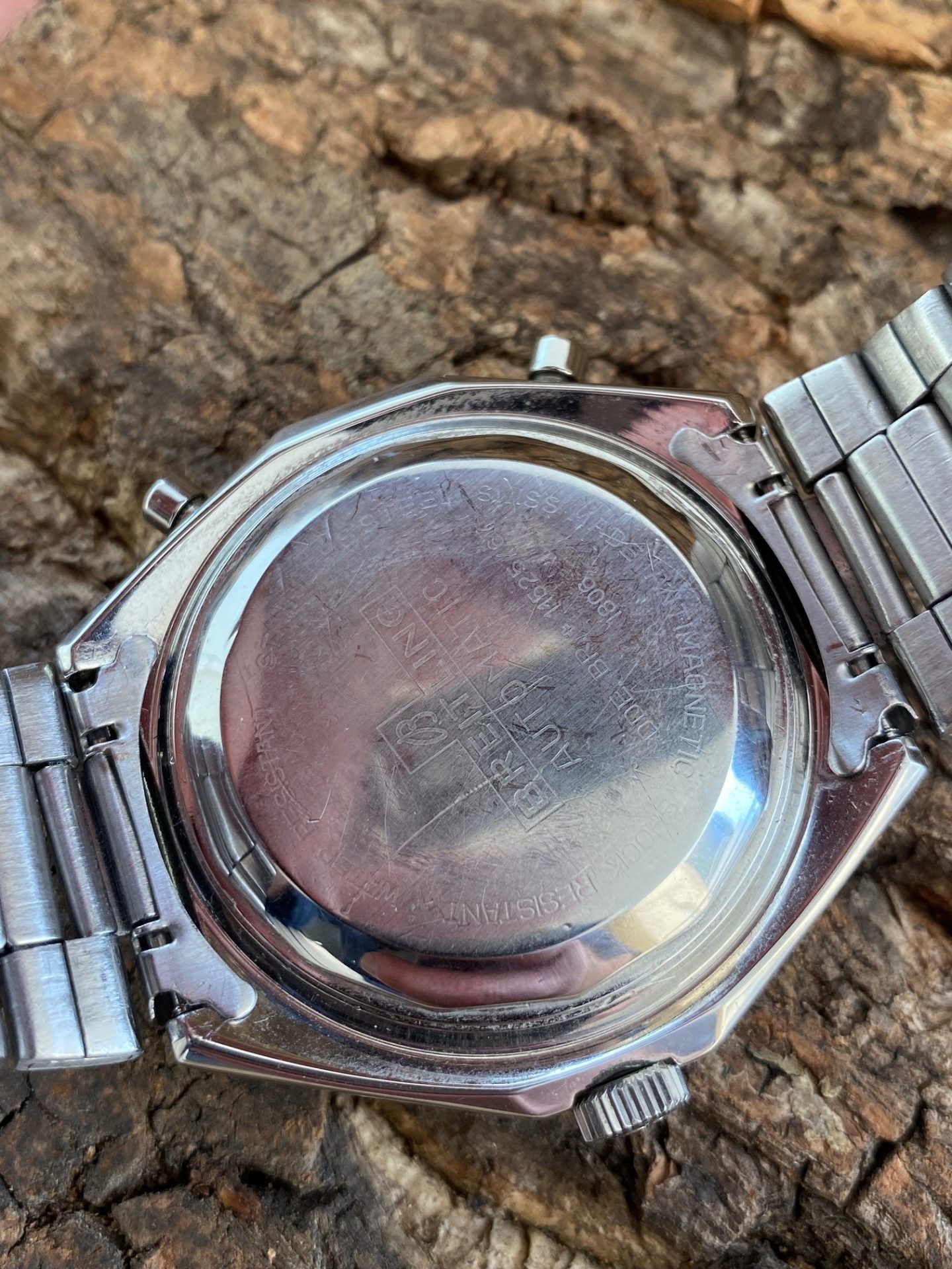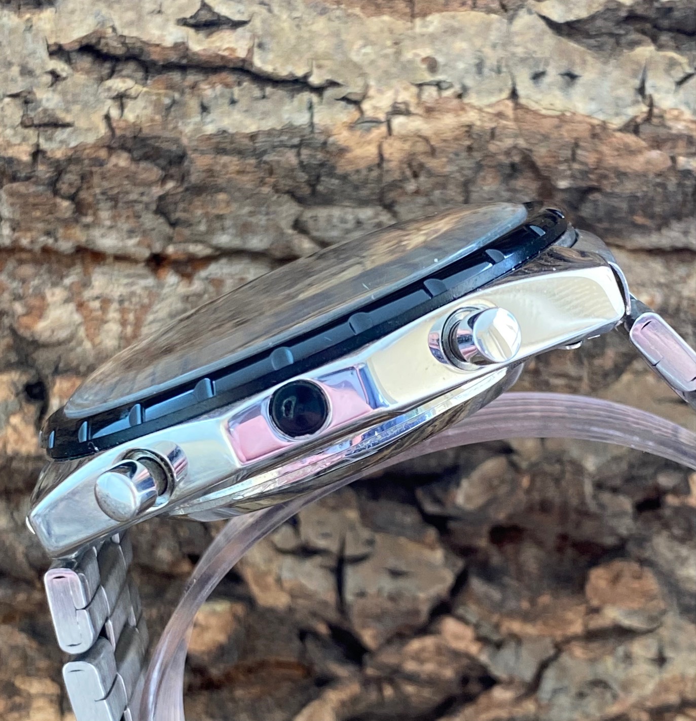 Tres belle CHRONOMATIC 1806 en très bon état venant d’être révisée avec une lunette de service neuve de stock, (lunette d’origine remise avec la montre). Chose rare, elle est vendue avec son bracelet acier d’origine et sa boucle déployante.