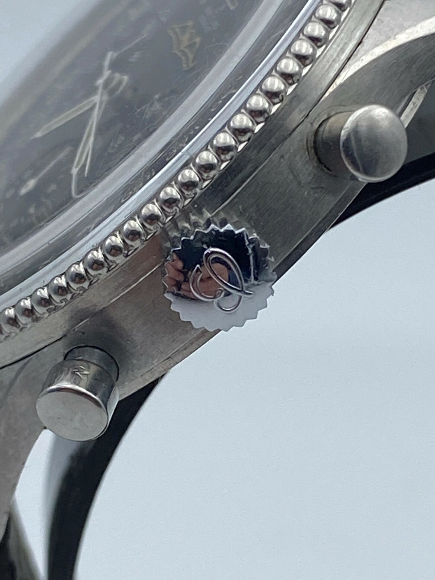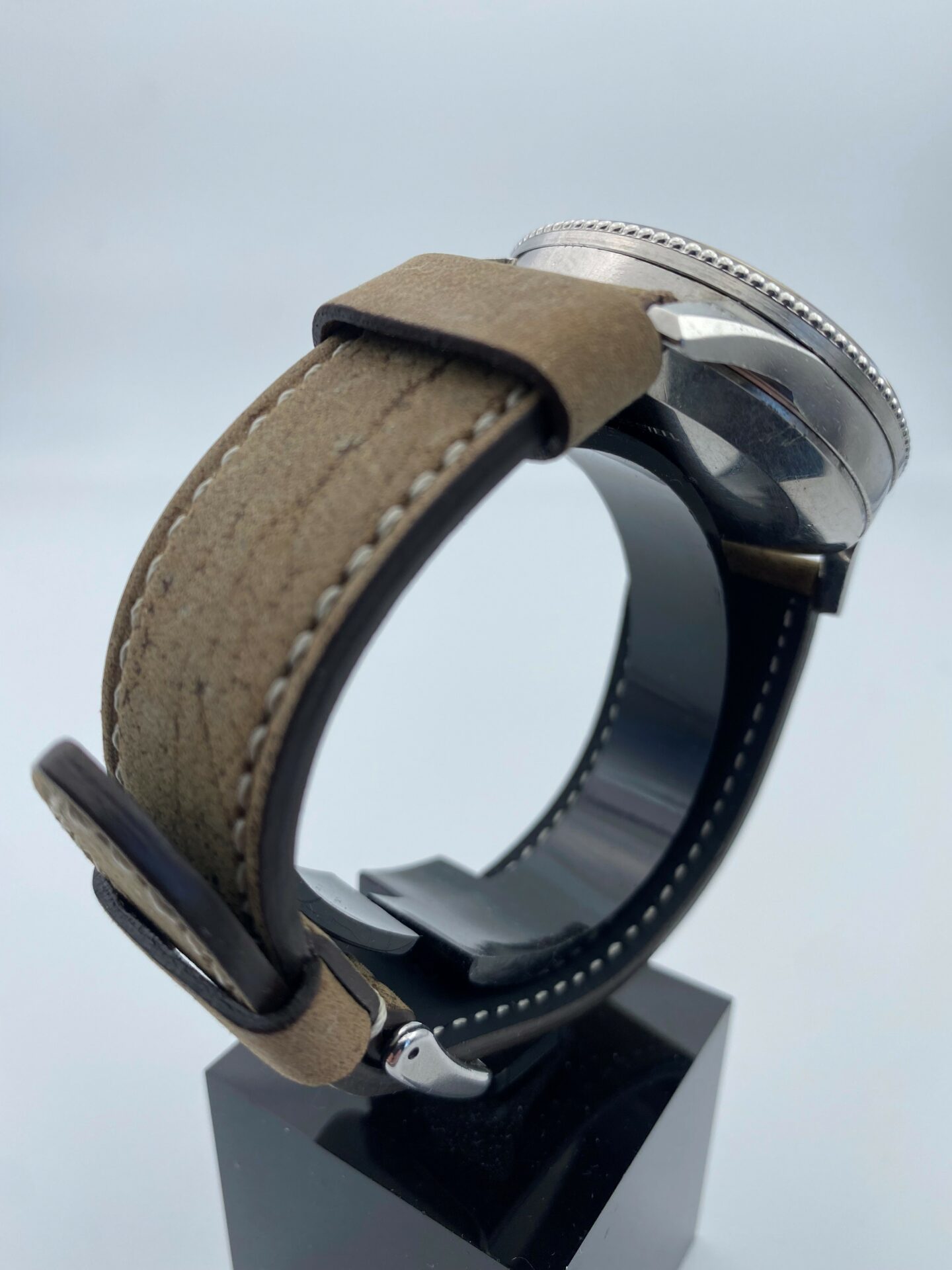 La montre présentée ici est assez rare, il s’agit d’un modèle de 1959. Ce modèle était le dernier à disposer de tous ses cadrans noirs et sa lunette en perle de riz, ce qui lui donne une grande élégance. Lunette qui sera à partir de fin 1963 modifiée en lunette crantée qui lui conférent selon nous une touche plus moderne puisque c’est ce modèle de lunette crantée qui équipe encore les modèles actuels.