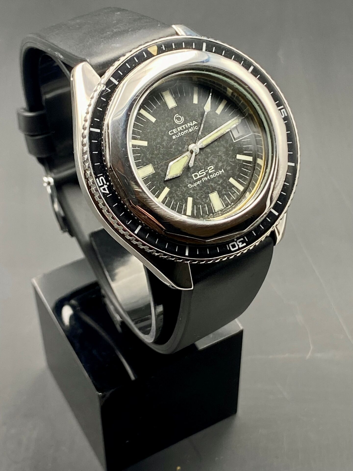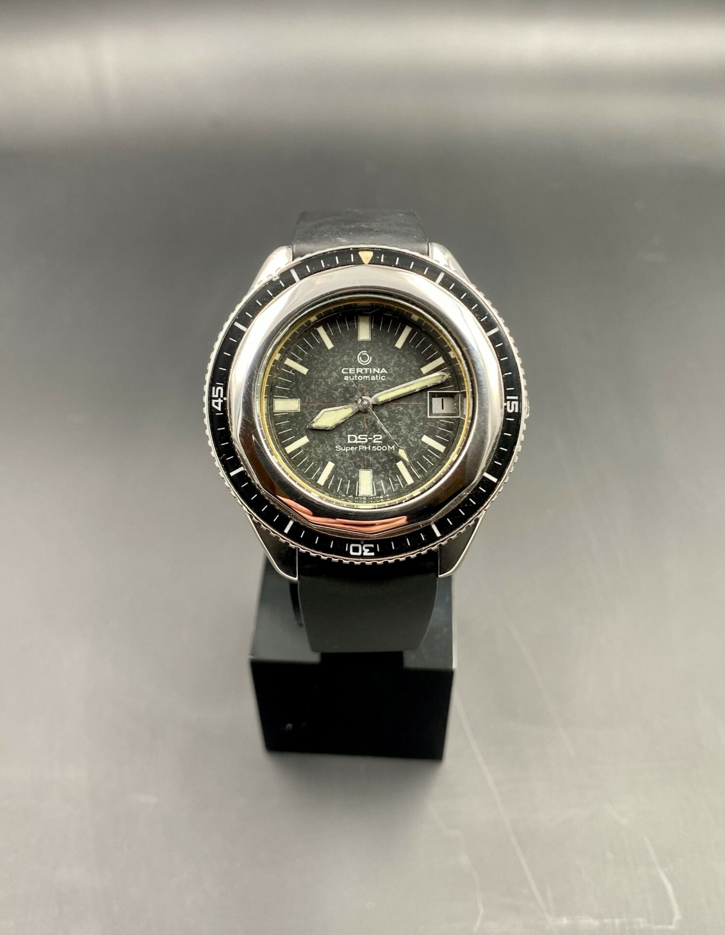 Very rare and sought after DS2 SUPER PH 500. When production of the DS 2 was launched in 1968, two versions were available: one was waterproof to 200m (part number 5801 303), the other waterproof to 500m (part number 5801 123). The DS-2 Super PH 500M was successfully used in the TEKTITE I & II experiments in 1969 and 1970. In addition, there is evidence that Certina had already supplied watches for the earlier US Navy experiment called Sealab II.
