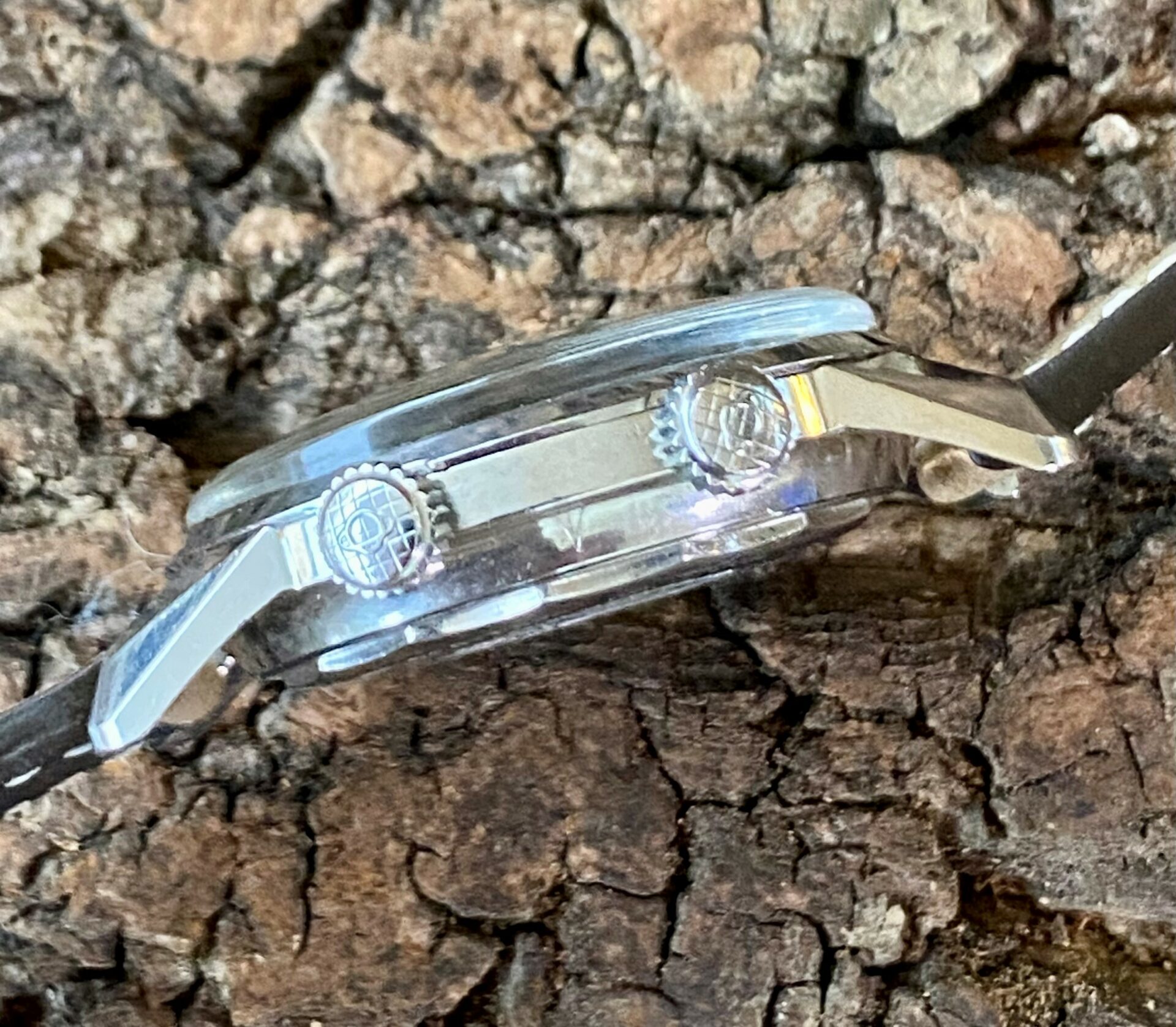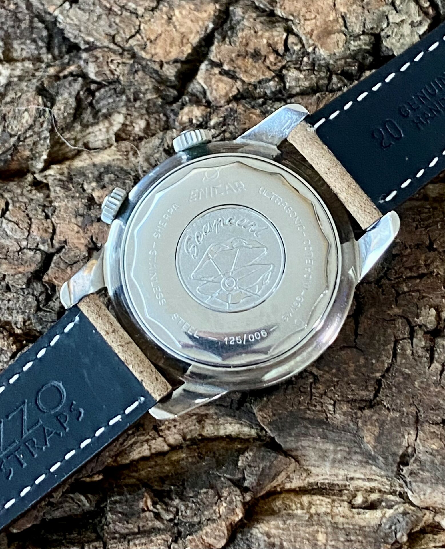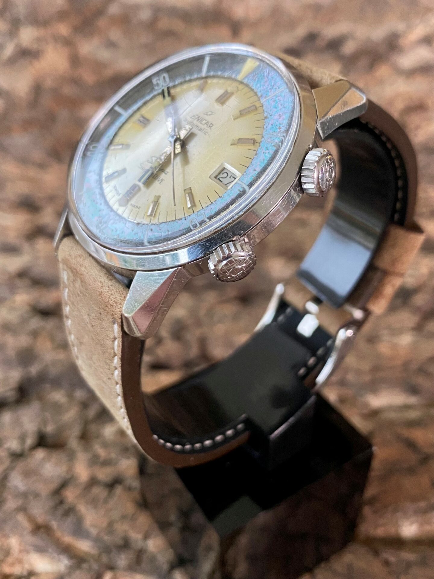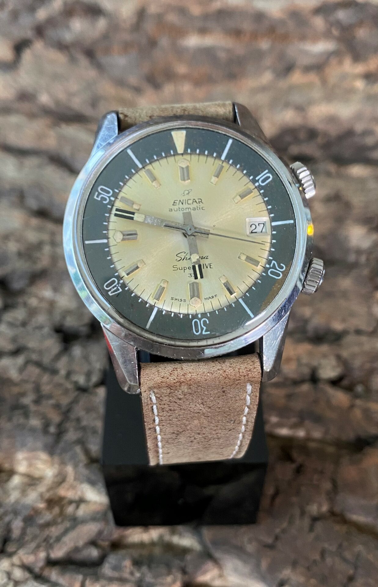 The watch on display is a Sherpa Super Dive, which is much more sought-after than its smaller sister, the Super Divette. For this model, Enicar has adopted the Compressor case. These cases were patented by Swiss case manufacturer Ervin Piquerez S.A. (EPSA) in the late 1950s. The case was designed so that when water pressure increased outside the case, the seal was compressed more, forming a better seal that prevented water from entering the case.