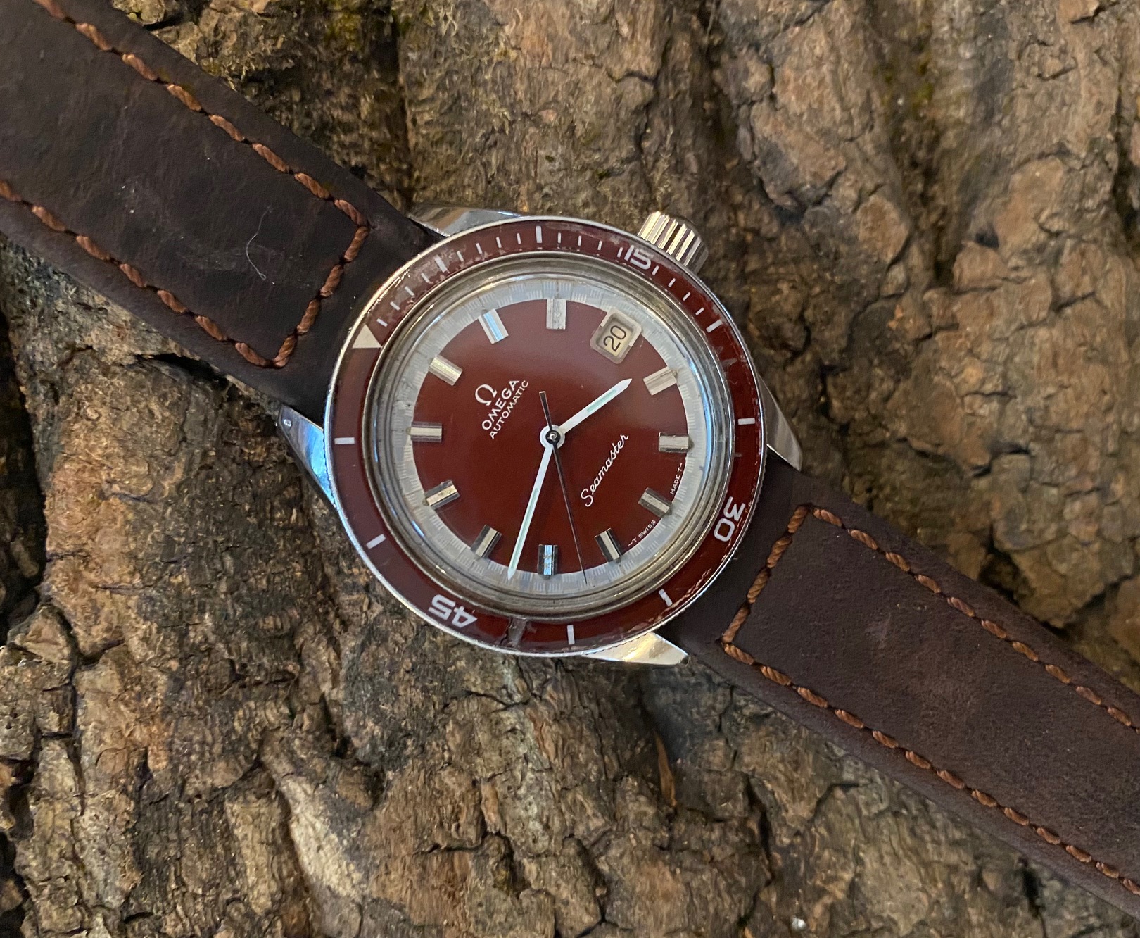 Beautiful seamaster 60 model with burgundy dial, rarer than the blue one, recently serviced. Please note a small lack of material on the bezel between 40 and 45 visible on the photos.