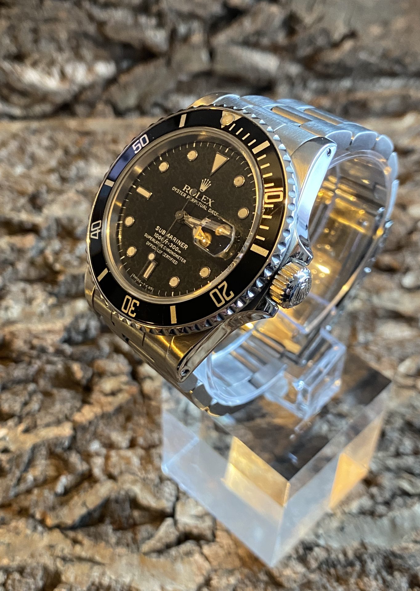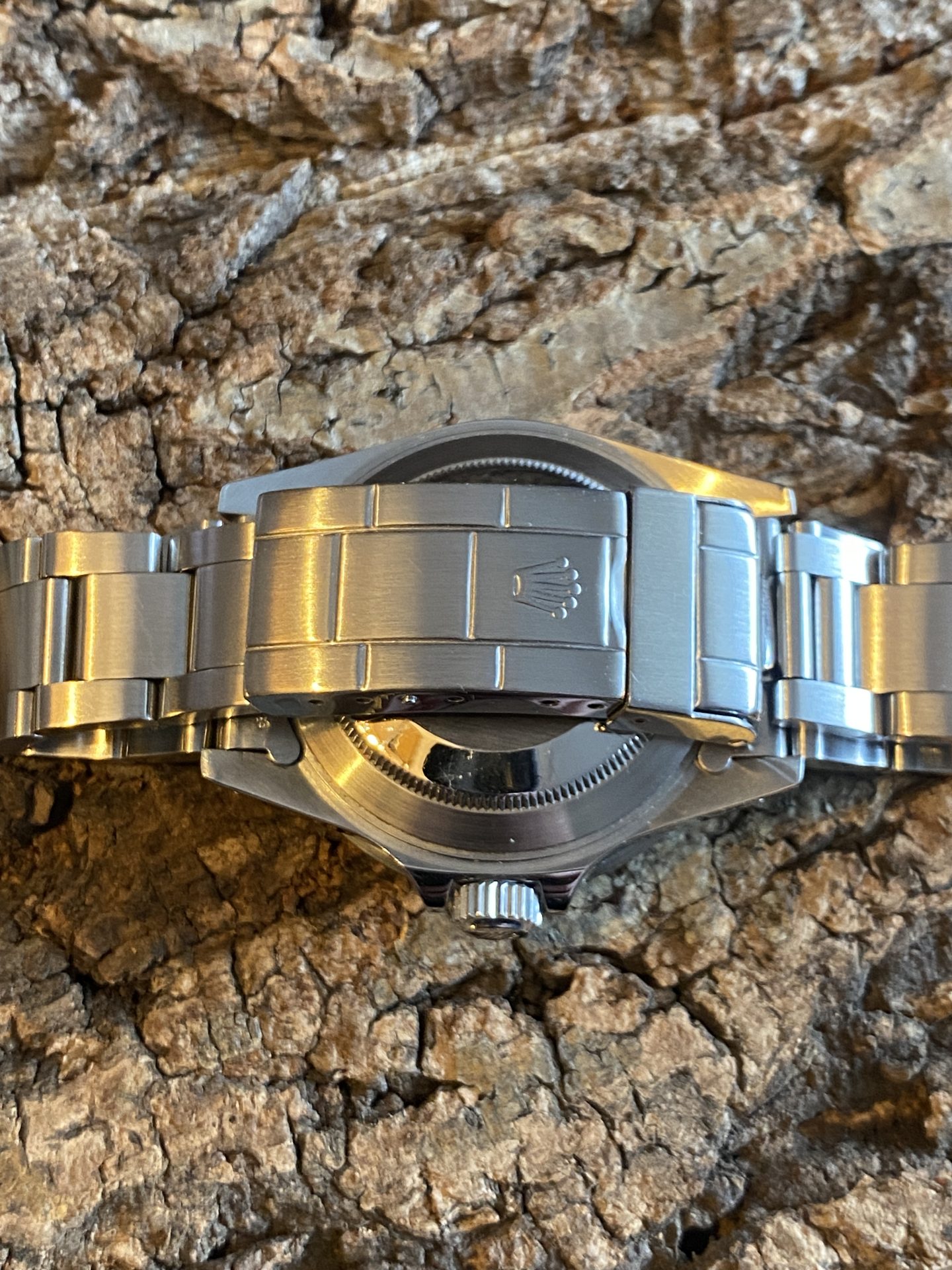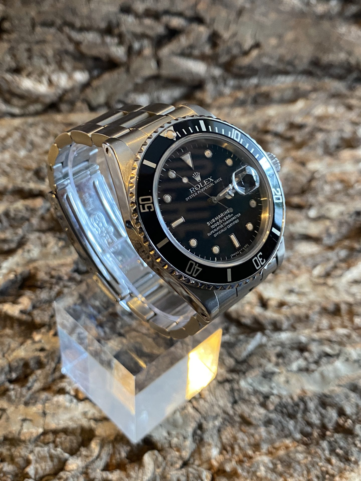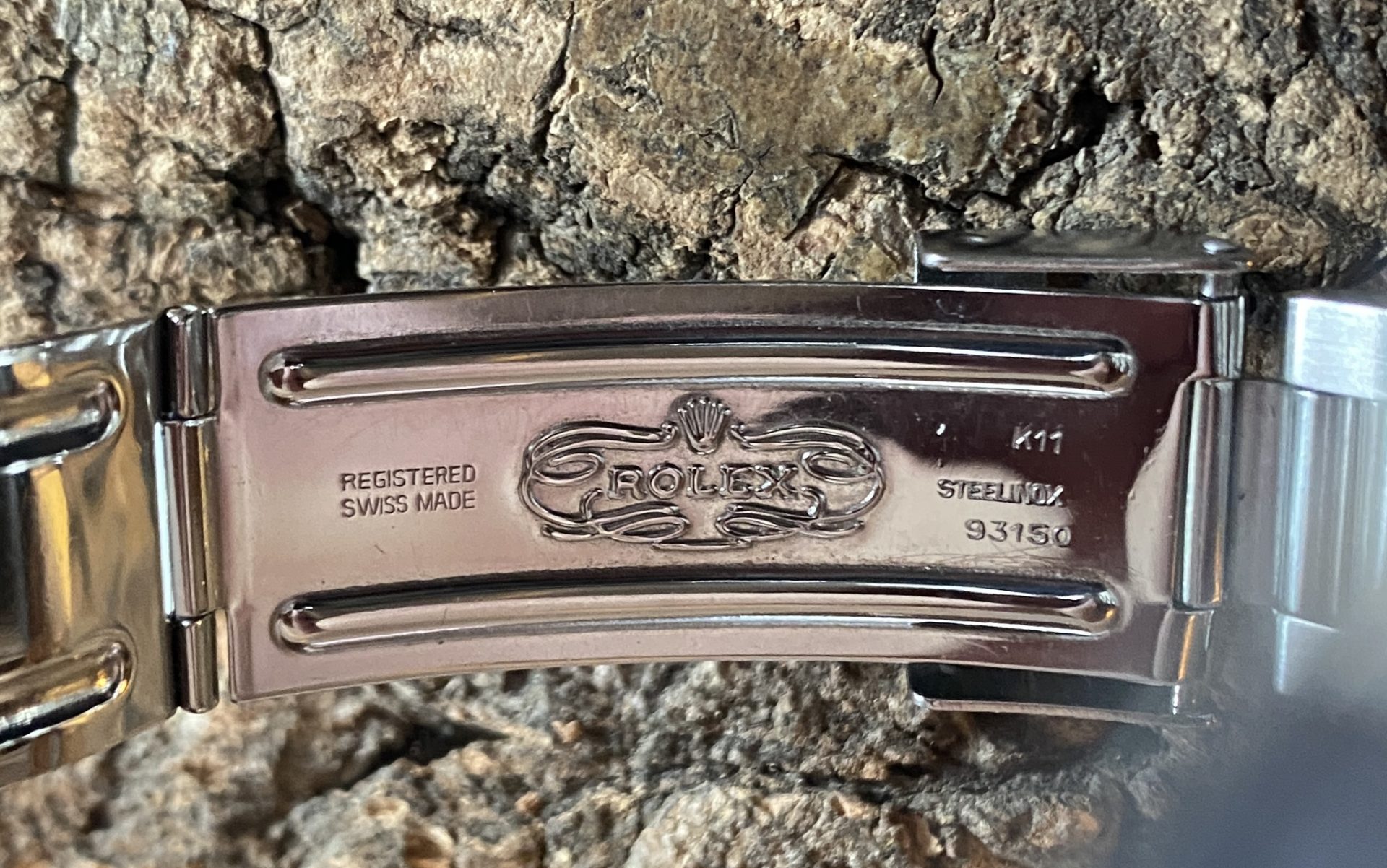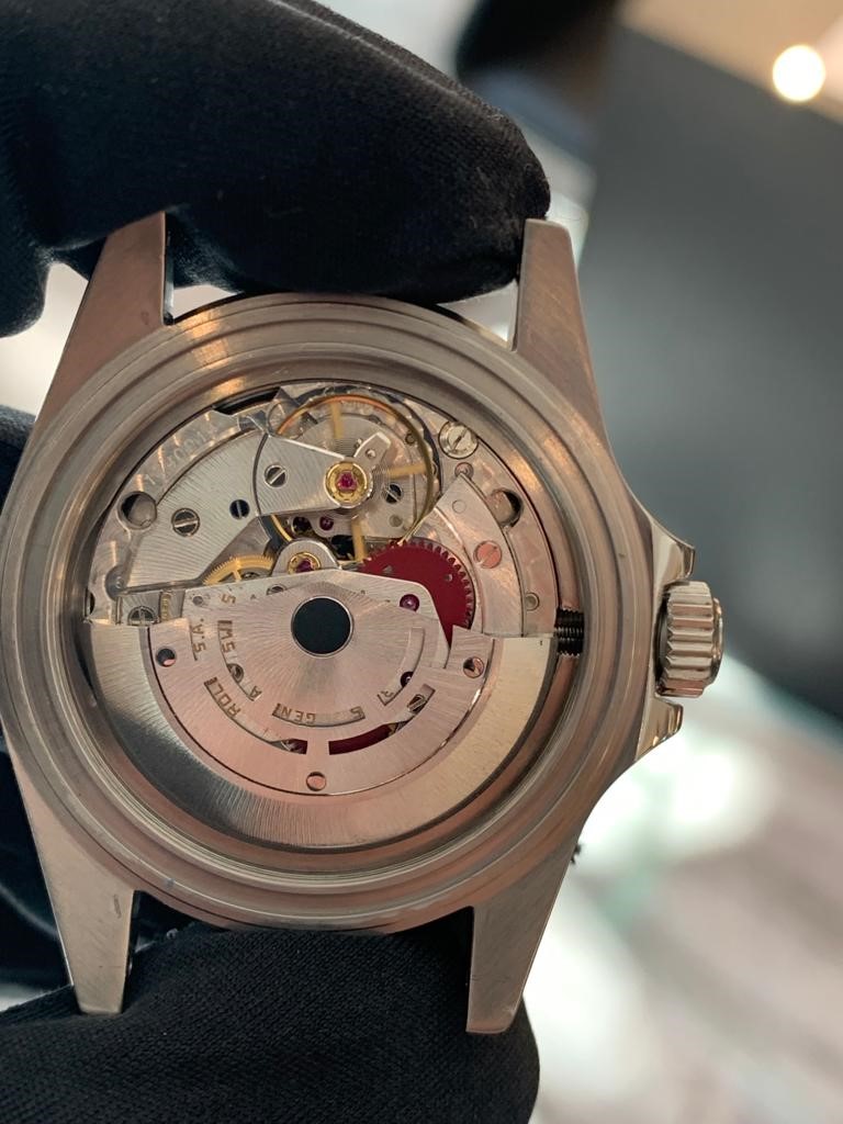This self-winding watch is equipped with the 27-jewel rolex 3035 movement. It features rapid date setting and a « Stop-Seconde » mode for setting the time. This movement is chronometer-certified, a guarantee of precision indicated on the lower part of the dial below the model and its maximum operating range. The whole represents four lines, a distinctive sign from which its nickname derives: submariner transitional four lines.
