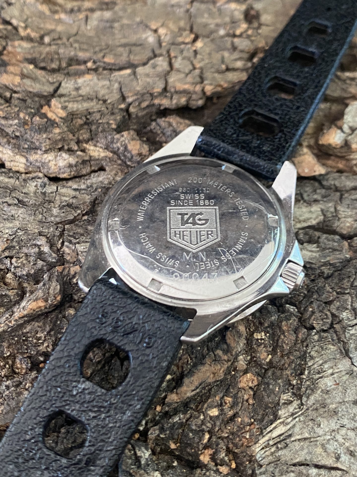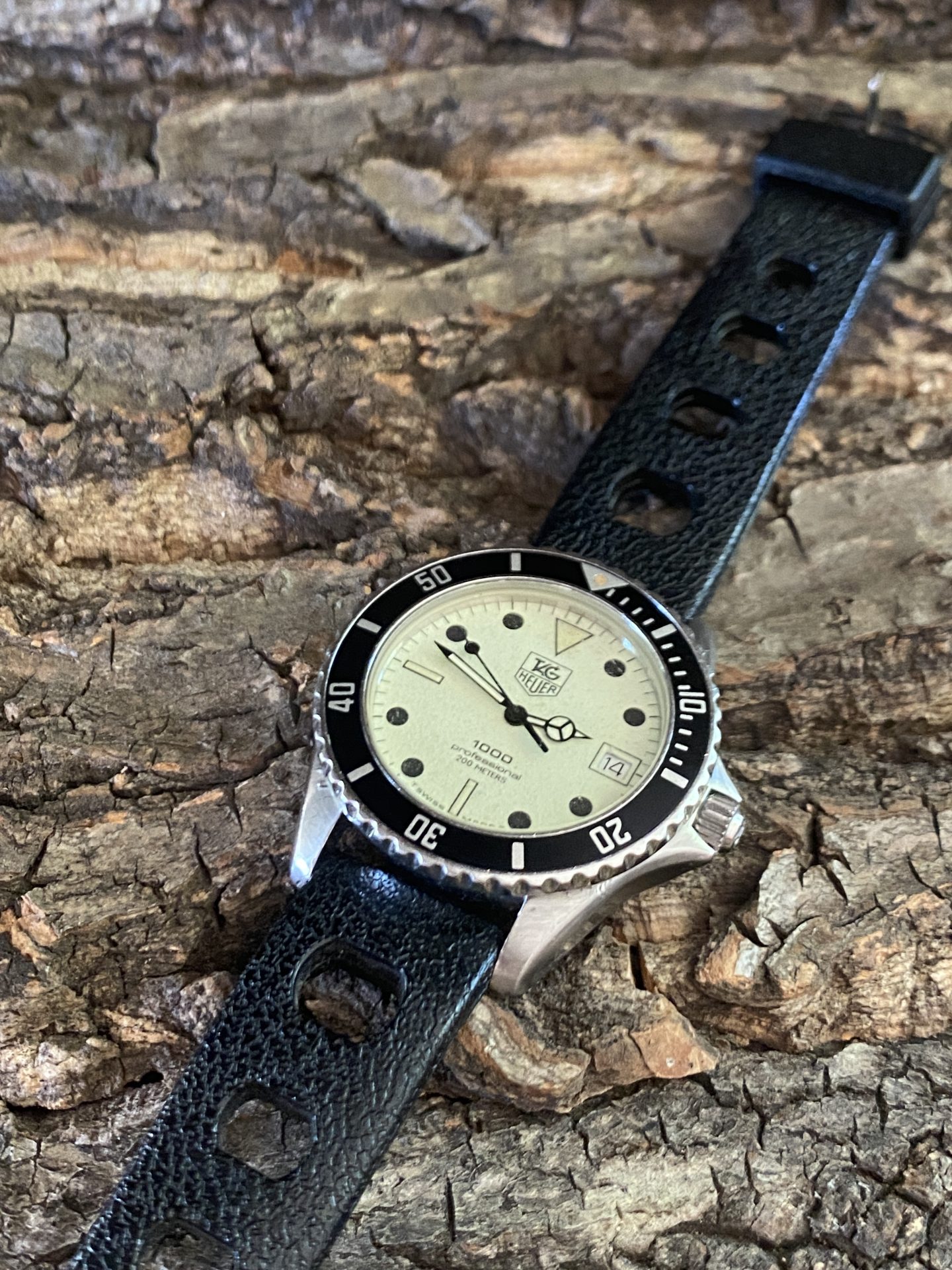 Montre de plongée militaire utilisée par les plongeurs de la marine nationale de l’arsenal de toulon, une montre fabriquée par tag heuer avec un cadran fluorescent et ses index et aiguilles noires caractéristiques datée de 1984 surnommée par les plongeurs militaires lumi 200 ou diver-lumi.