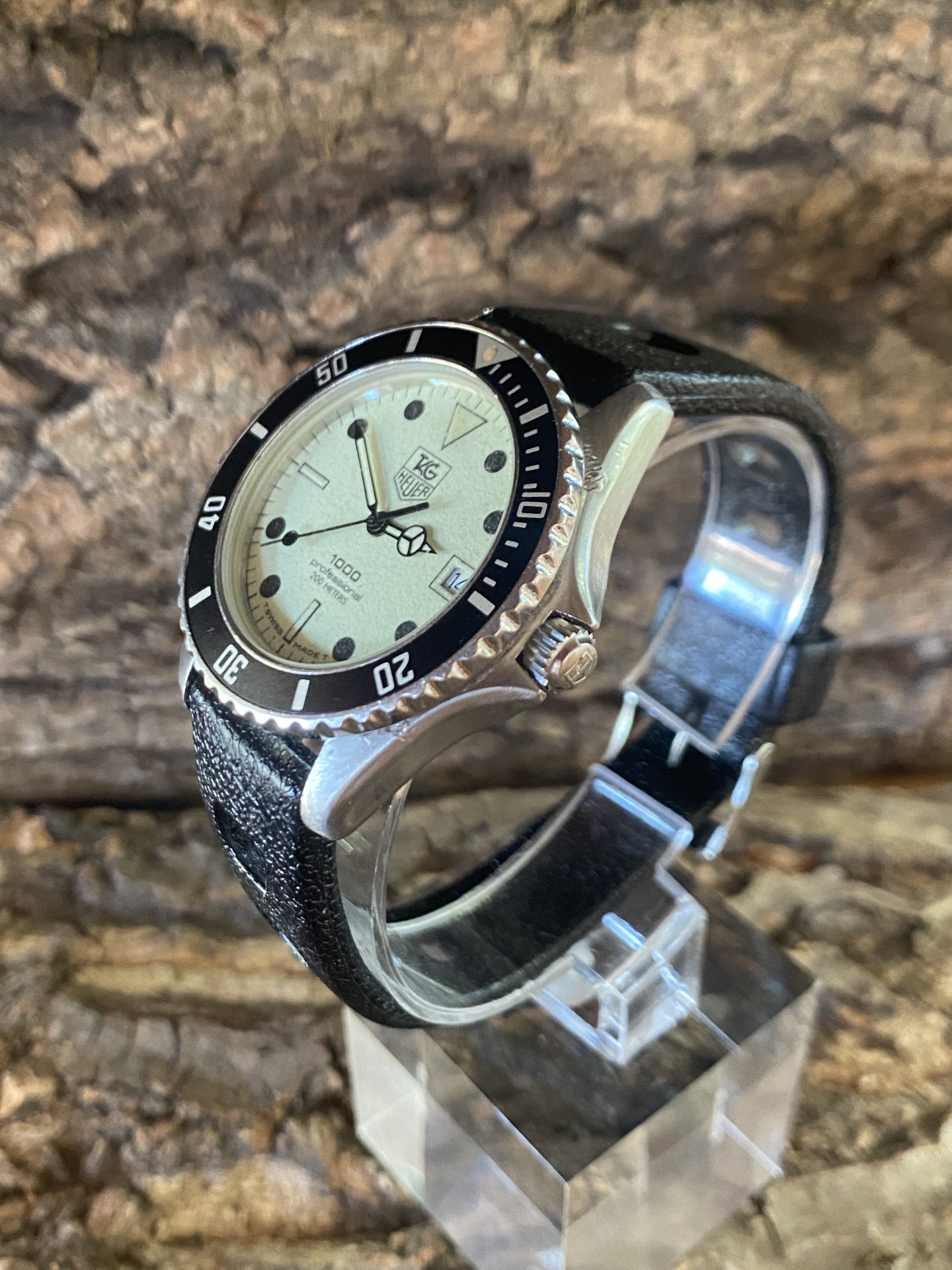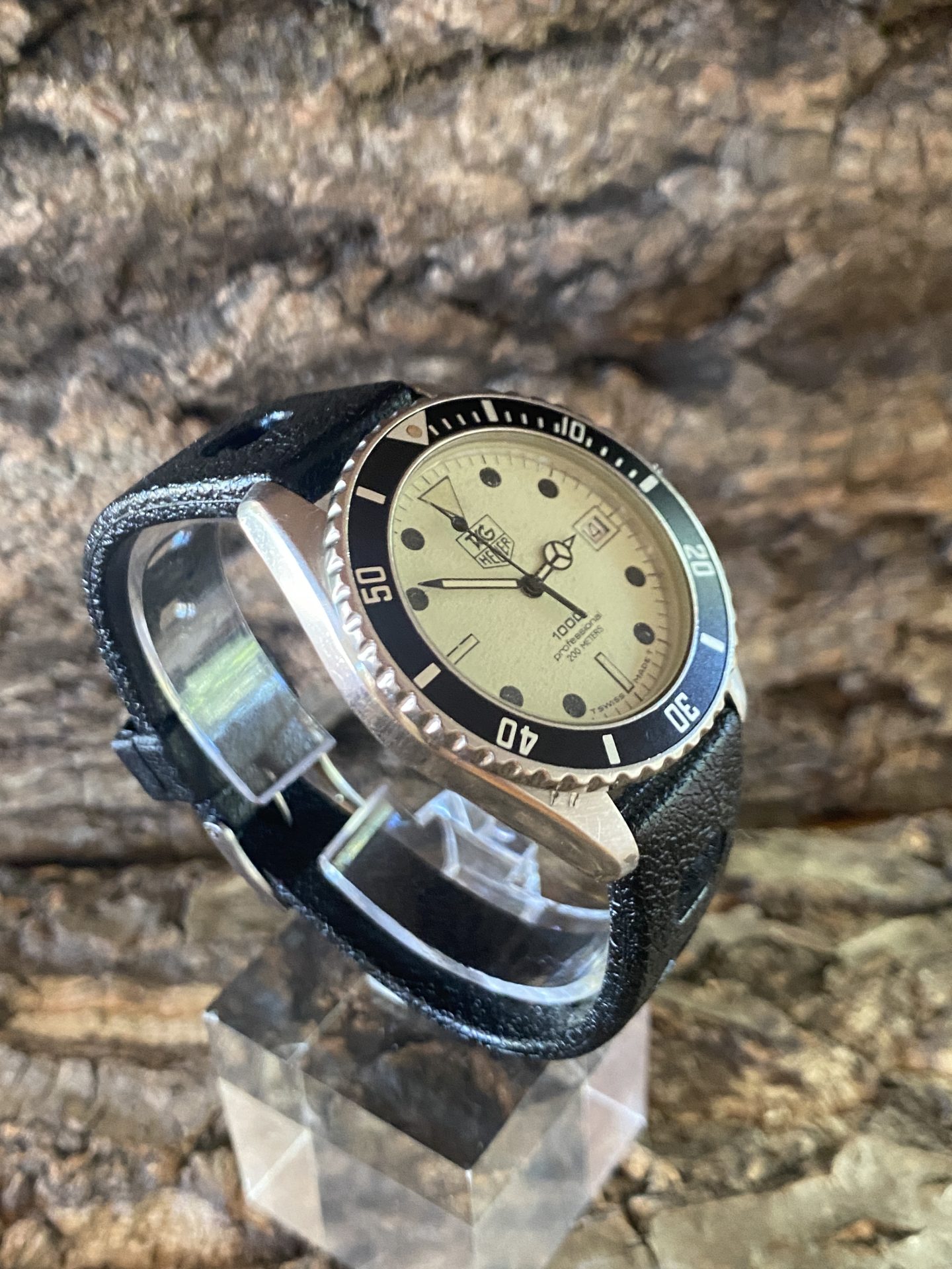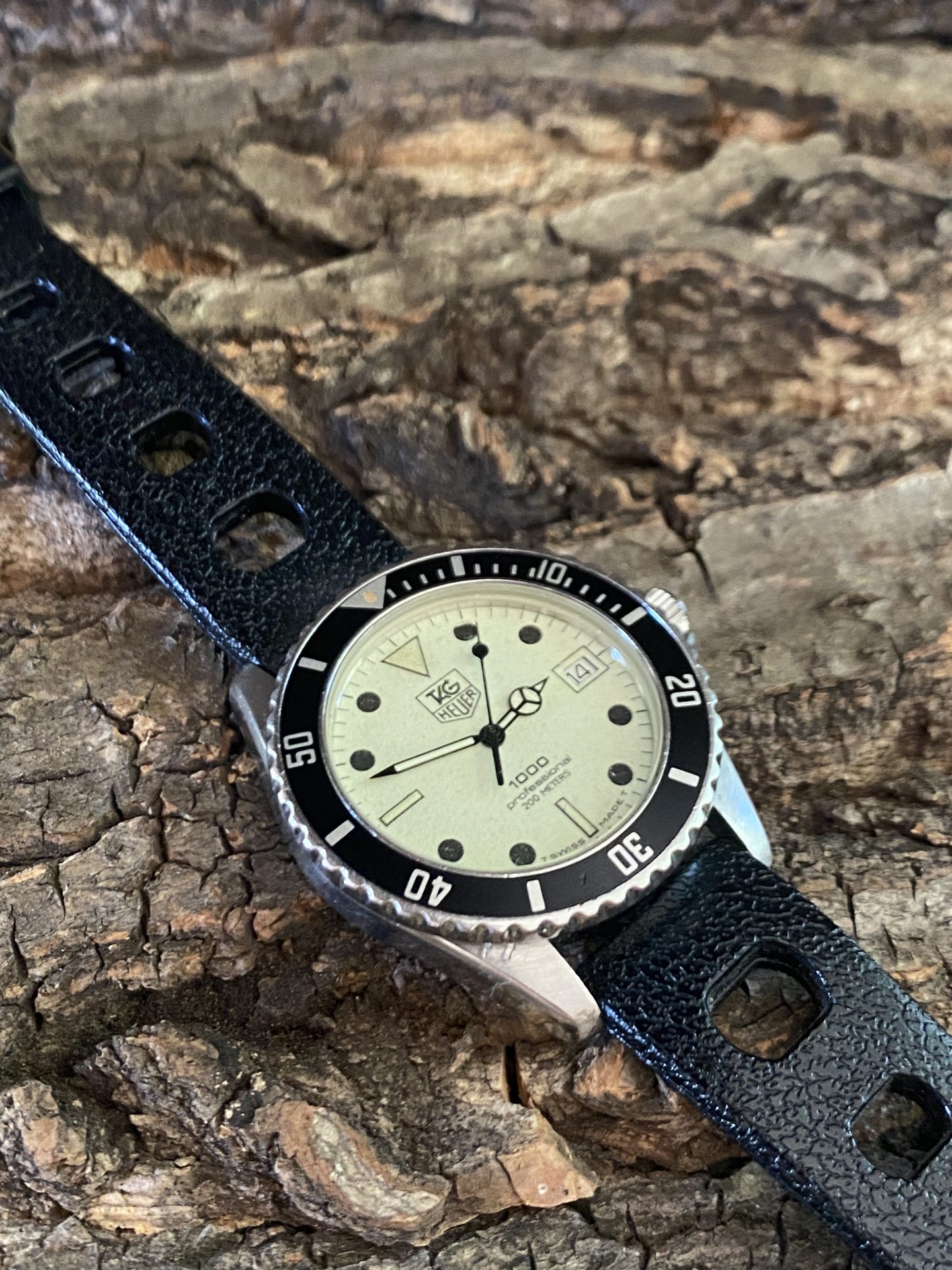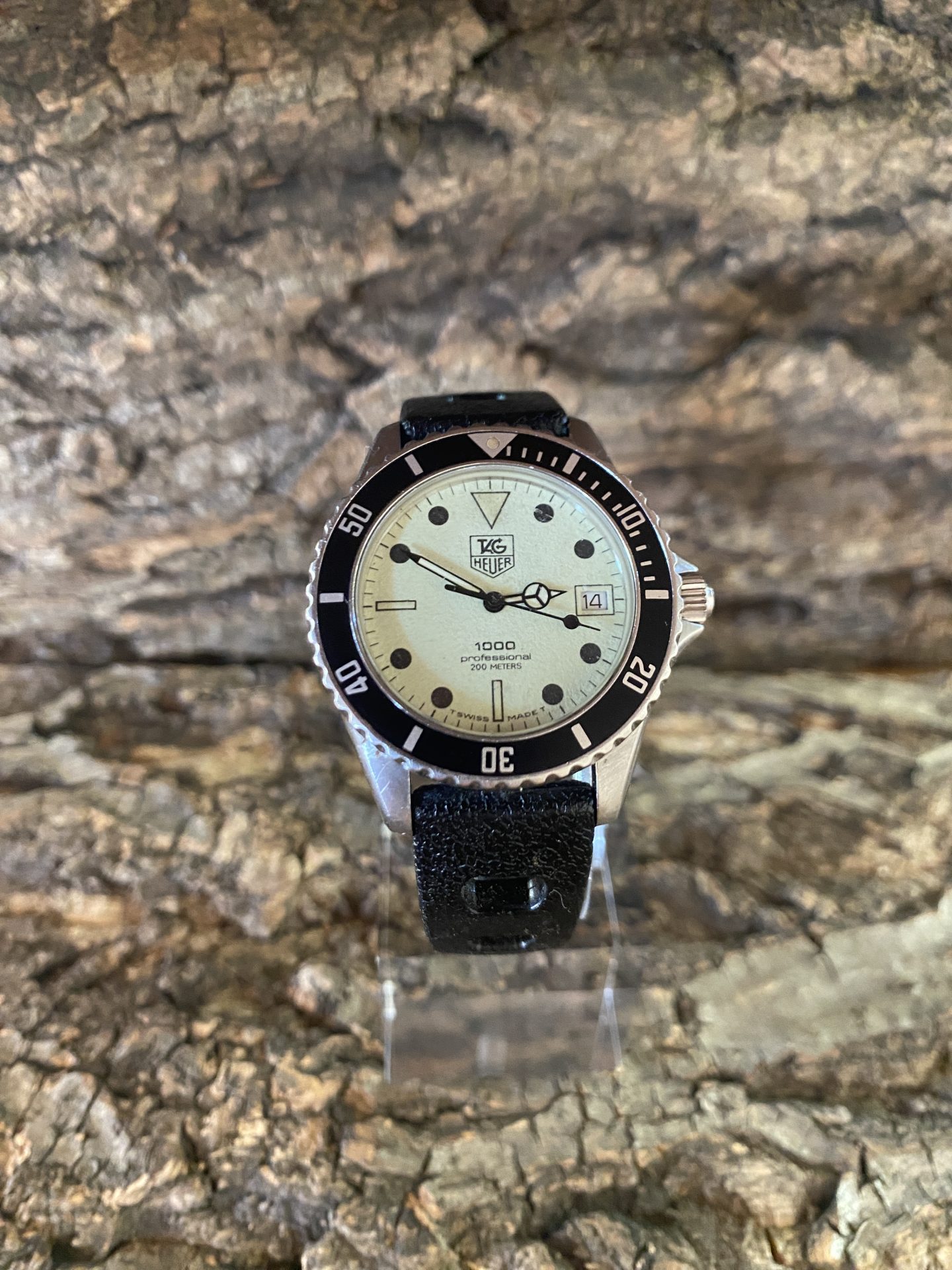 Military diving watch used by the divers of the national navy of the arsenal of toulon, a watch manufactured by tag heuer with a fluorescent dial and its characteristic black indexes and hands dated 1984 nicknamed by the military divers lumi 200 or diver-lumi.