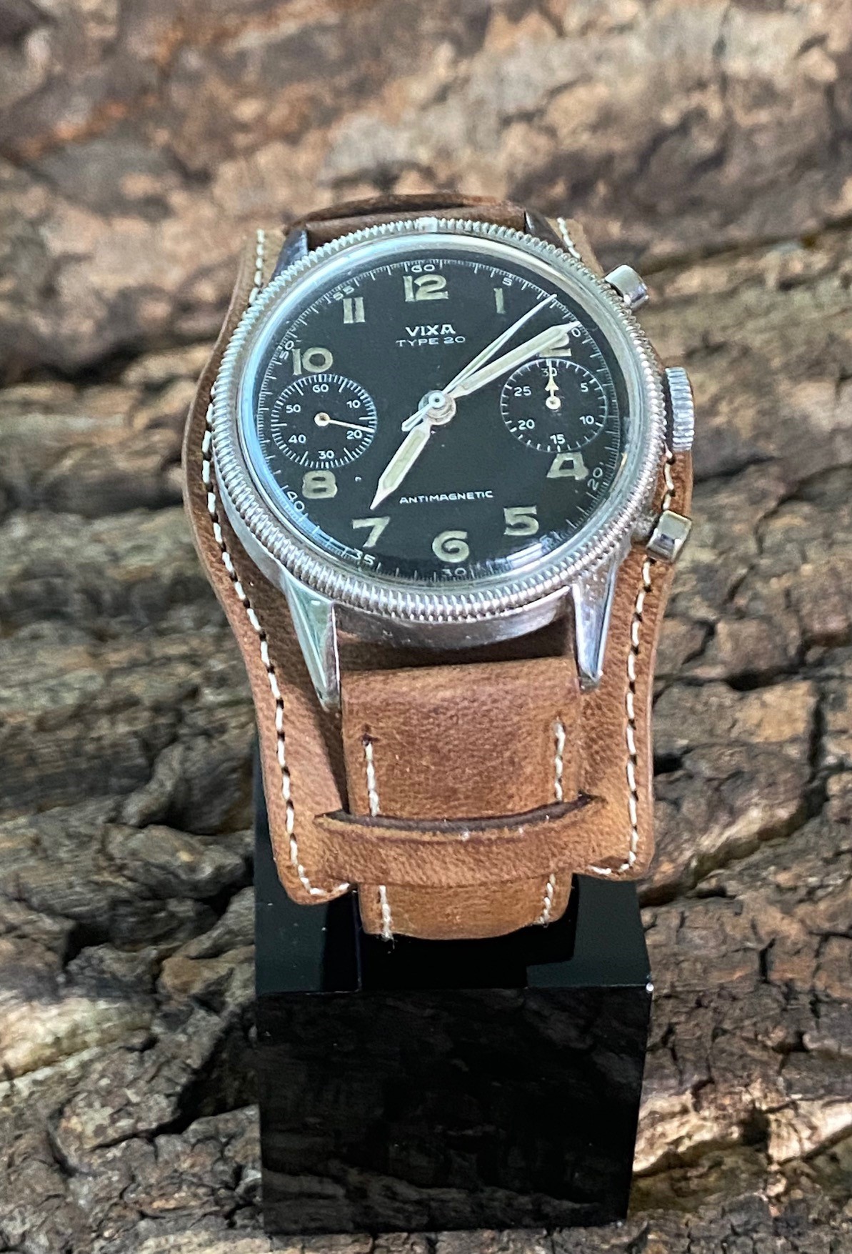 This chronograph is one of the watches made from movements delivered by Germany as war reparations after the Second World War. This watch, assembled by Kiplé in France under the VIXA brand, is made from case parts and movements manufactured in Germany by Hanhart.