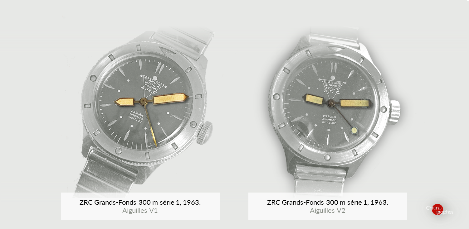 Cette toute première série a la particularité de disposer d’aiguilles magnum avec bouts coniques rempli, de sa couronne dite « petite » en fait plus plate que la seconde version et sa trotteuse droite qui sera remplacé par une lolipop. Quant au fond riveté on le retrouvera sur la version suivante 1.2, il disparaitra à la fin de production sur la rare 1.3 avec un fond vissé.