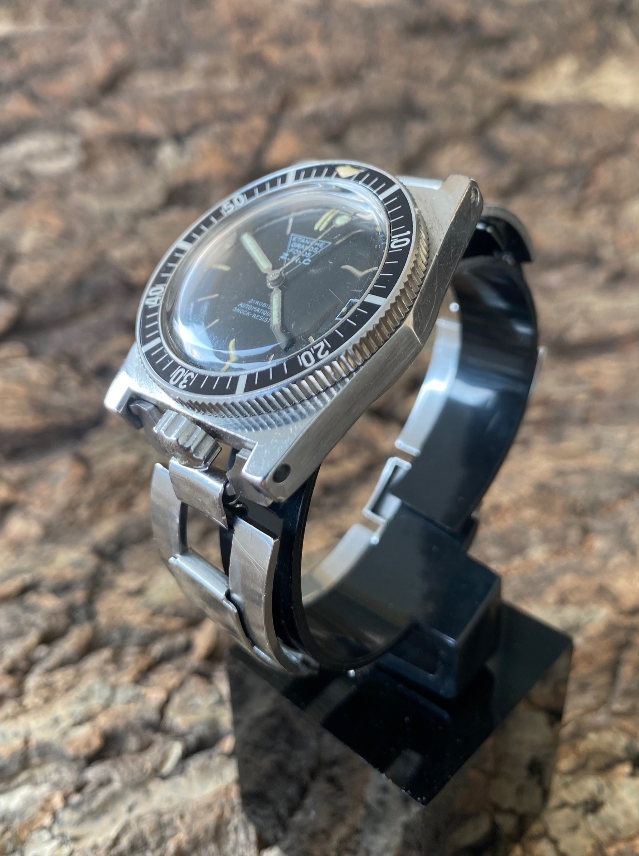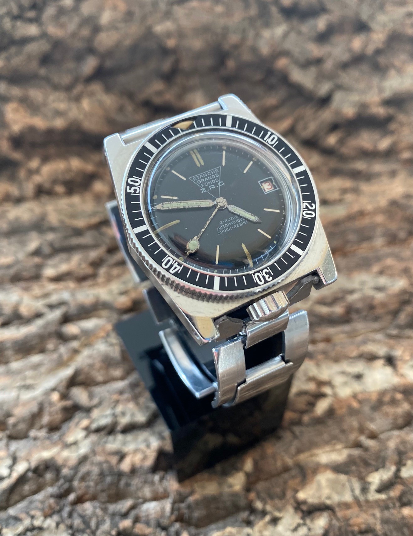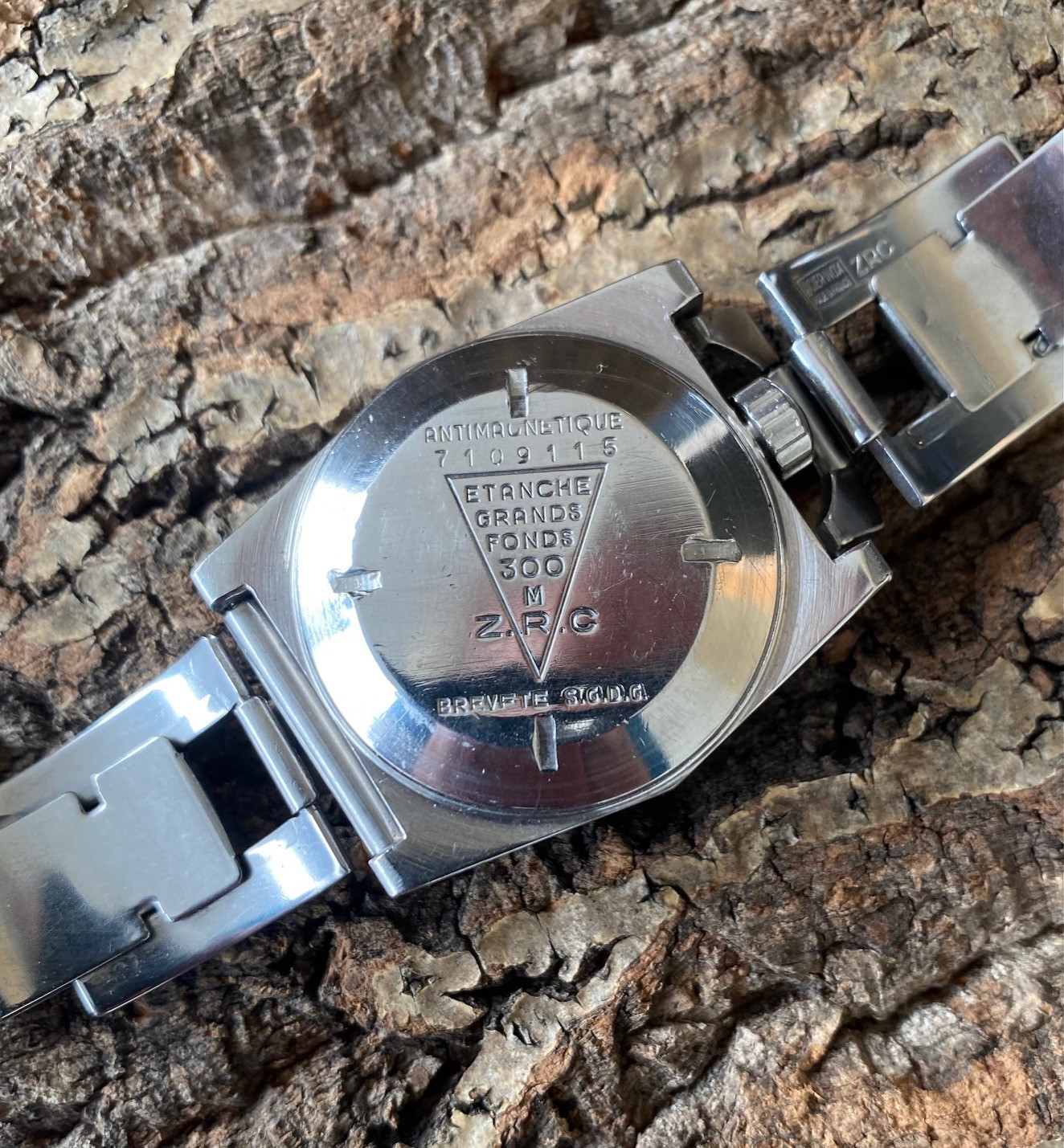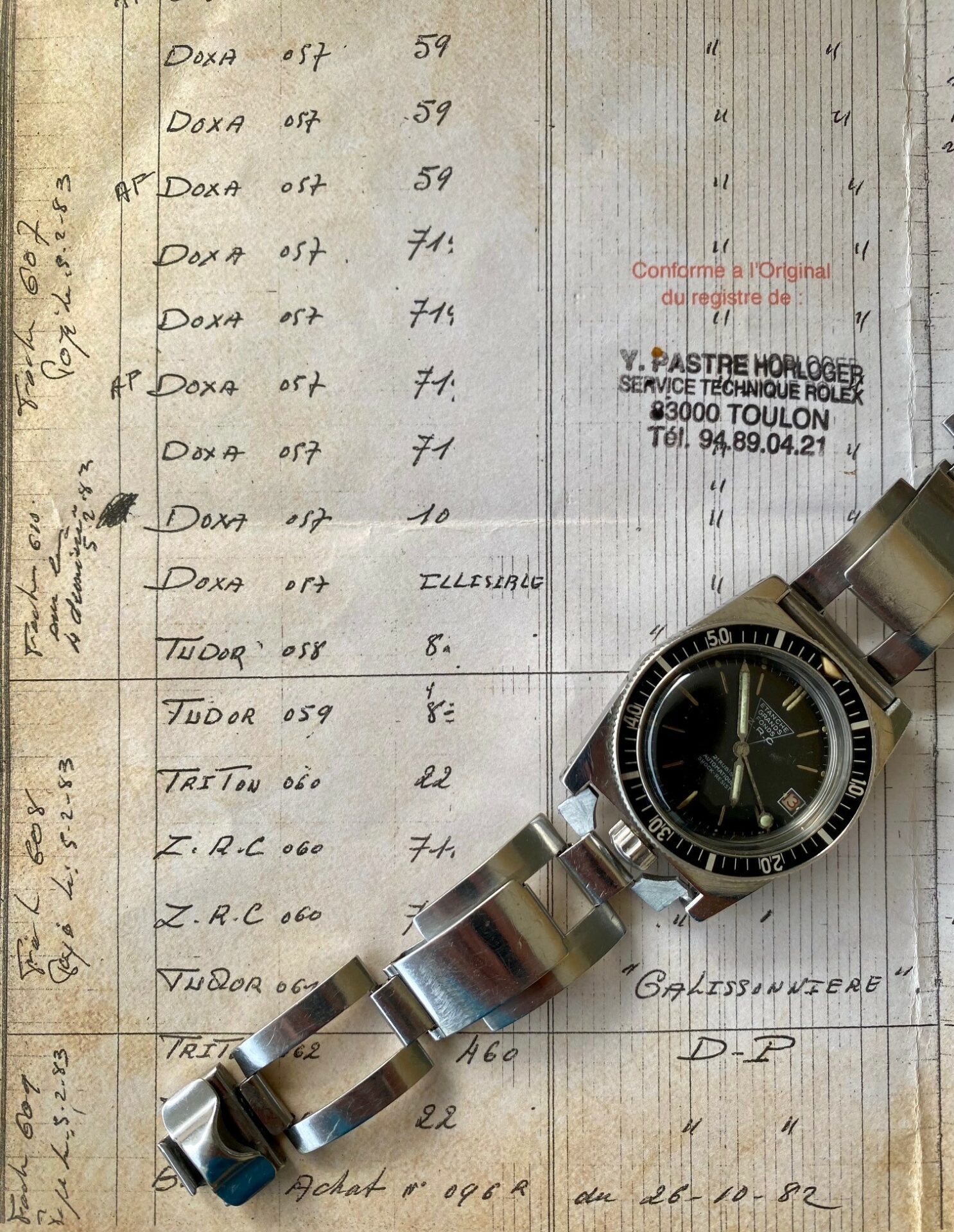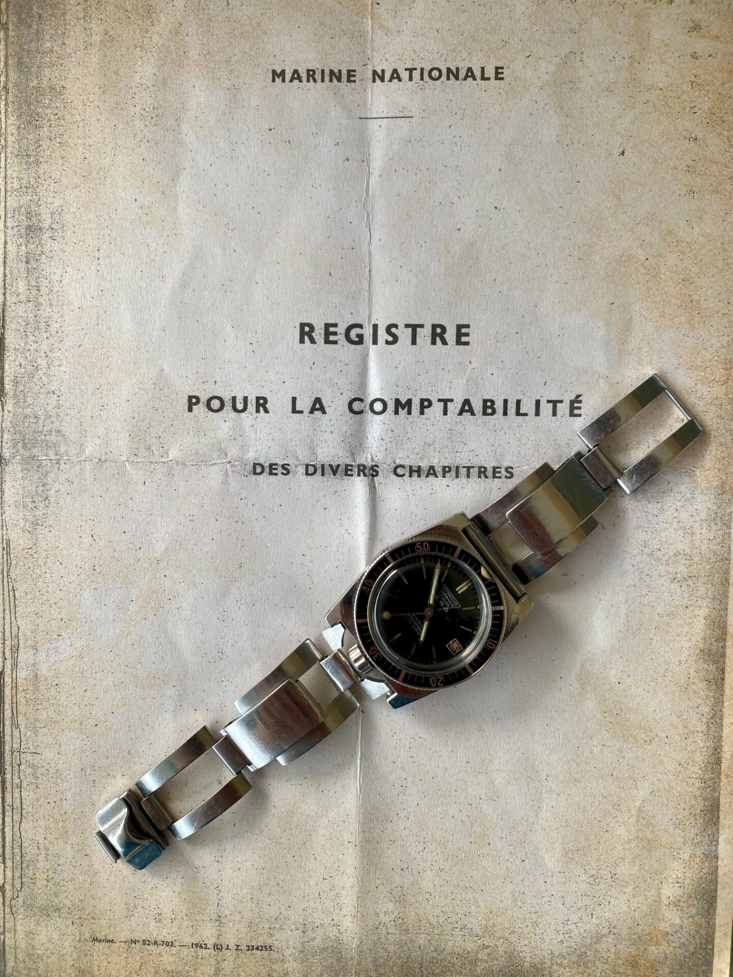 Recently re-edited by ZRC, series 3 is the ultimate evolution of the Grand Fonds. The watch presented here is exceptionally beautiful, and its bezel and dial are in very good condition, a rare feature on a series 3. Its particularity, and what makes it so valuable, is that this watch was assigned to a French Navy unit based at the Toulon arsenal, as attested by the extract from the book by Yves PASTRE, official watchmaker to the French Navy in Toulon. This extract will be delivered with the watch. Of course, it has a split crown, a modification requested by the combat swimmers who were equipped with it to facilitate disassembly and improve water-resistance. According to a source very close to the French Navy, the ZRC was delivered over a period of 12 to 13 years, at a rate of around 25 pieces per year, in series 2 and 3. Hence the extreme